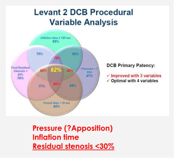 LEVANT 2等研究明确,残余狭窄 <30% 与DCB术后更高的一期通畅率密切相关。