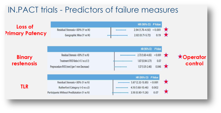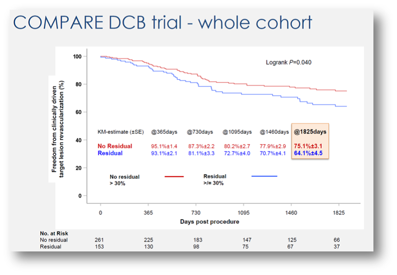 残余狭窄 >30% 是影响临床驱动靶病变再干预(CD-TLR)的独立危险因素。IN.PACT和COMPARE DCB研究均证实,无残余狭窄患者的远期免于CD-TLR率显著更高。