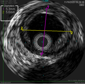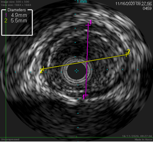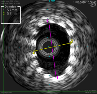 使用Sterling球囊预扩张后植入Eluvia DES的病例。IVUS评估显示,支架植入后管腔获得显著,但在支架局部不规整处最小径仅为3.7mm,提示局部扩张可能不充分。