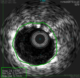 图:支架形态规则处,有效面积24.1mm2,最小径 5.3mm,最大径 5.7mm。