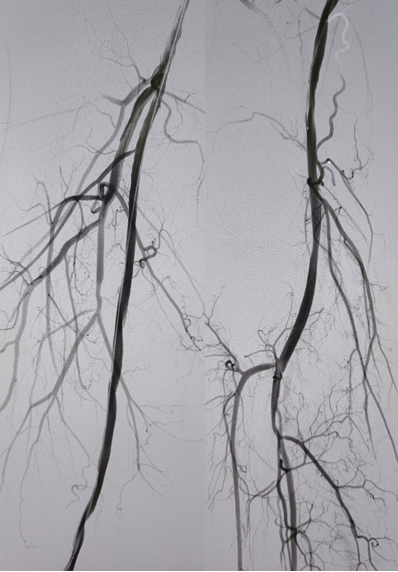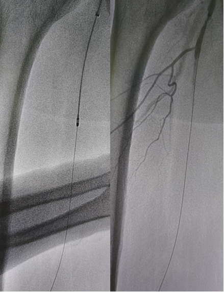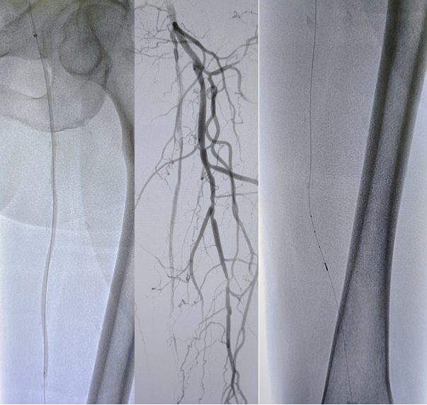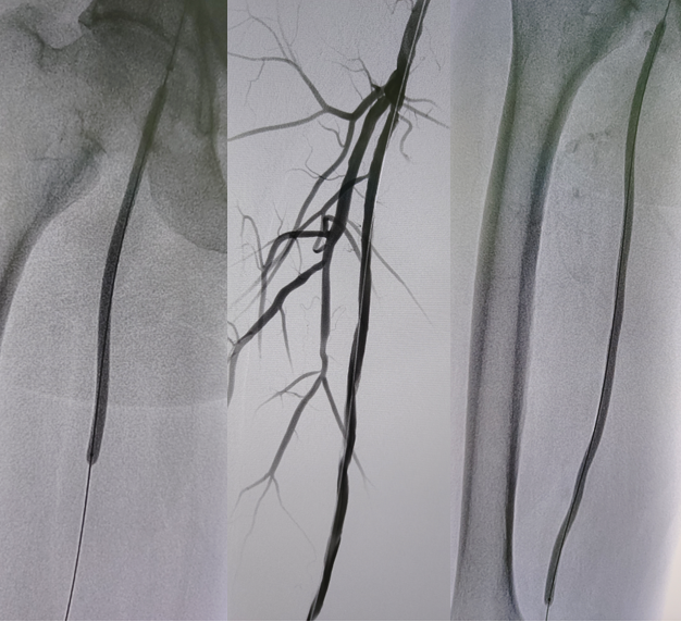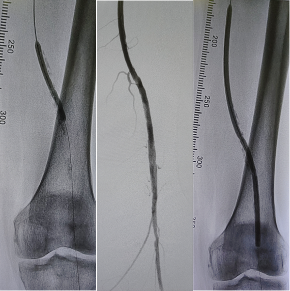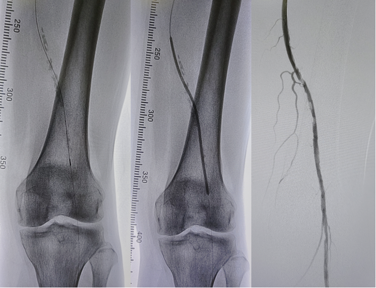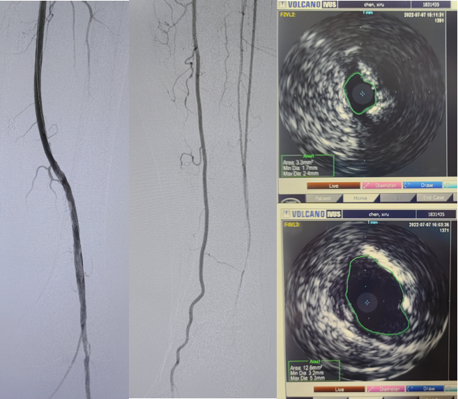 一例重度间歇性跛行患者,导丝通过股腘动脉CTO病变后,若仅凭DSA判断,可能直接进行Rotarex减容。但IVUS检查发现导丝实际位于内膜下(假腔)。此时若进行减容,风险极高。术者遂调整策略,改用球囊扩张后植入Viabahn支架,成功避免了严重并发症。