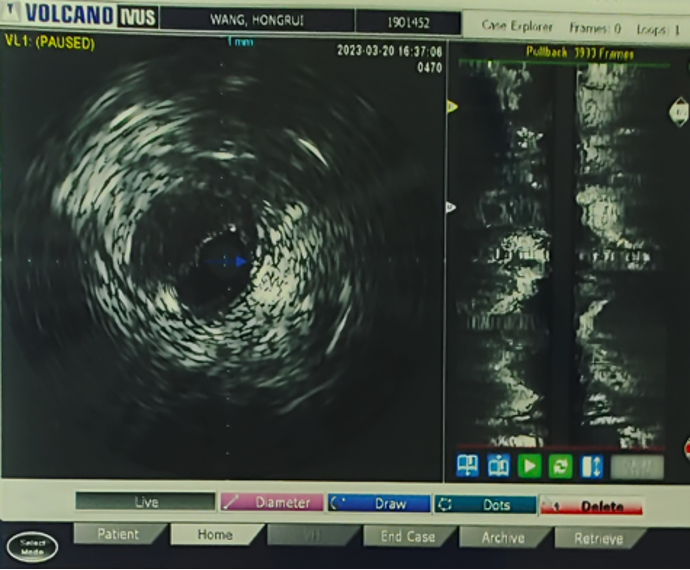 斑块性质: IVUS可以清晰区分软斑块、纤维斑块、钙化斑块和血栓。不同性质的斑块需要不同的处理策略。例如,对于钙化斑块,可能需要选择旋磨、切割球囊或冲击波球囊;对于血栓负荷重的病变,则可优先考虑机械血栓清除。