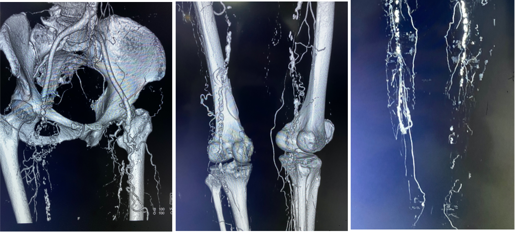 右股总-髂外闭塞,左股-腘动脉全程闭塞,膝下流出道显示不清,重度钙化