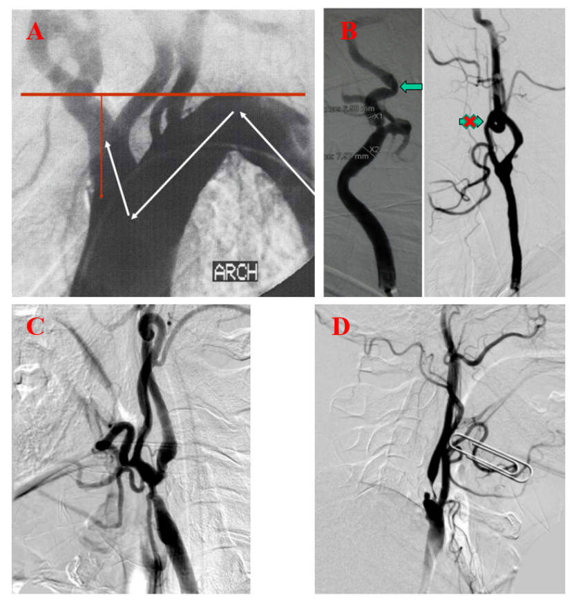 图:A:困难入路-主动脉弓型;B:困难入路-动脉扭曲;C:病变位置-分叉型;D:病变性质-溃疡型