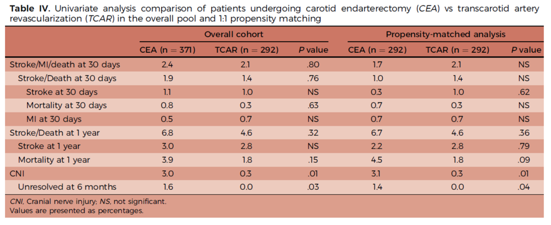 图:TCAR与CEA在卒中、死亡、心梗等方面均无明显差别