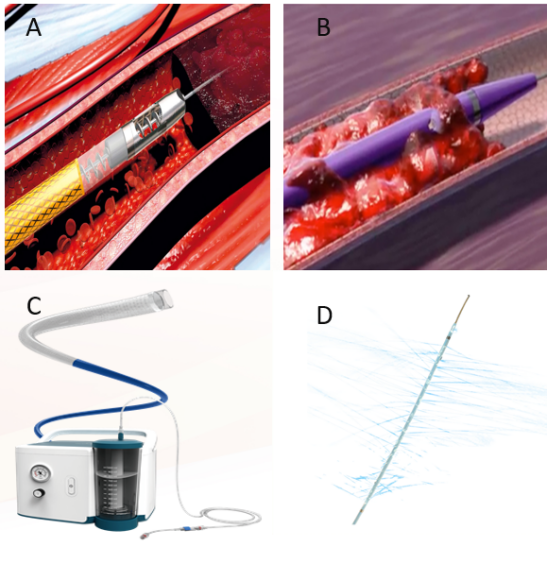 图:管腔减容分类:AB:机械血栓清除;C:负压抽吸;D:导管接触溶栓