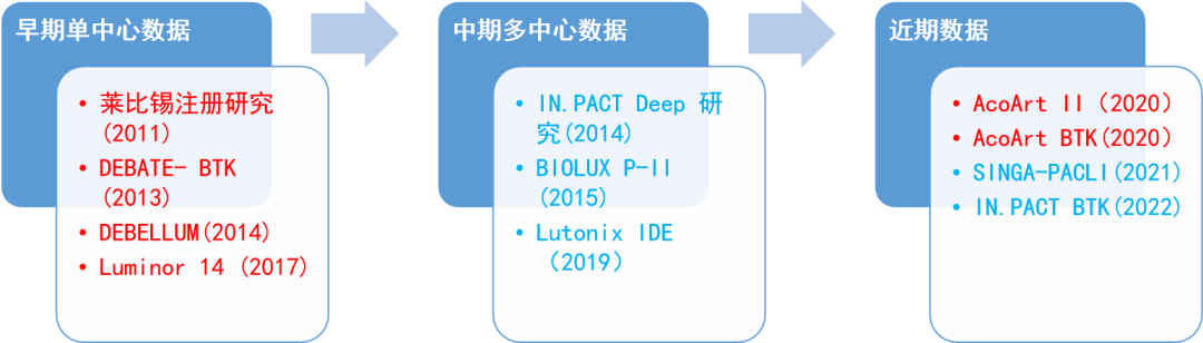 图:膝下动脉DCB相关研究,红色为阳性结果,蓝色为阴性结果