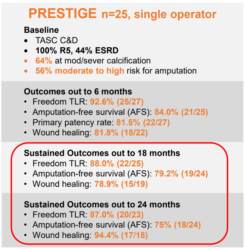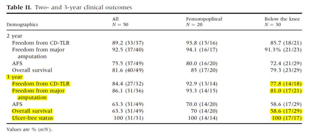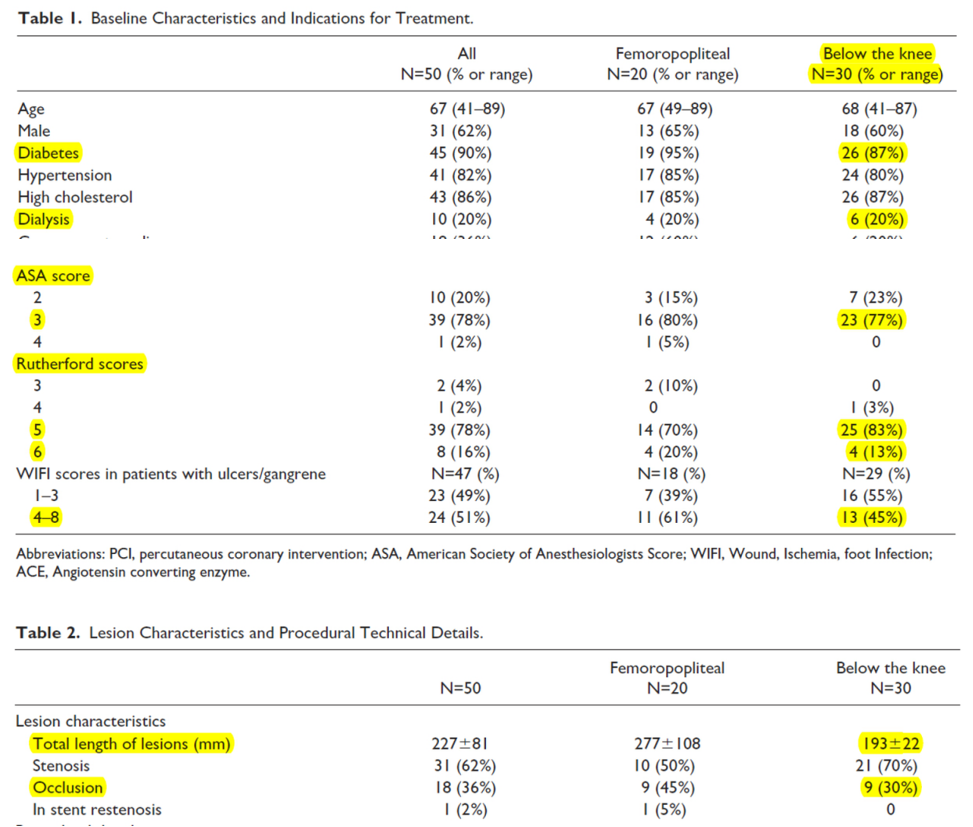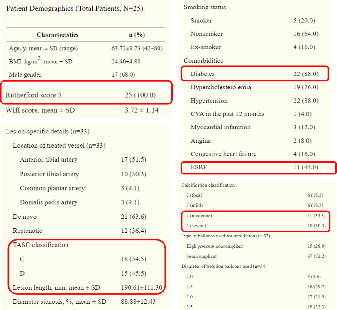 人群:25例严重CLI患者,100%为Rutherford 5级,88%合并糖尿病,44%为终末期肾病。
