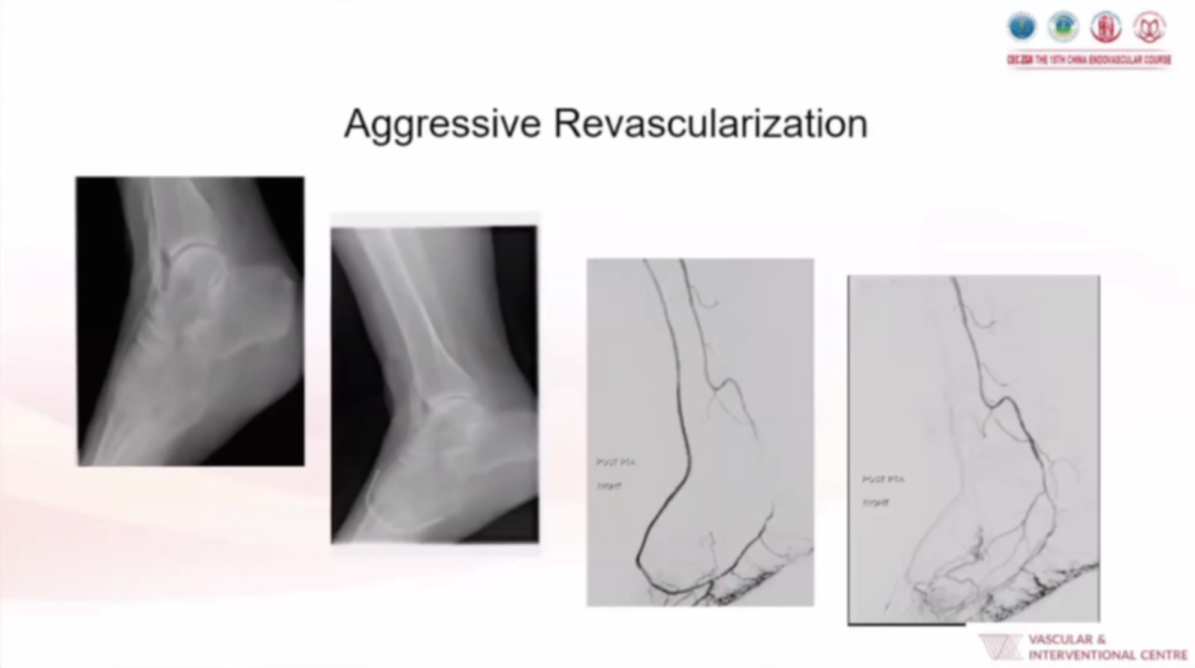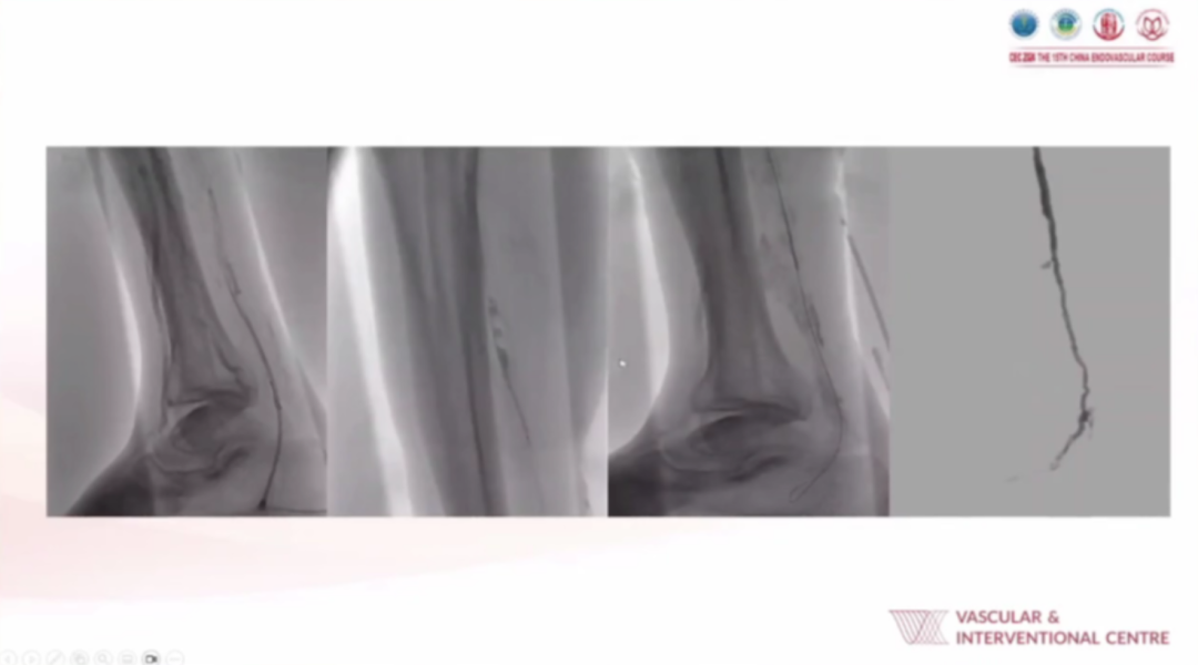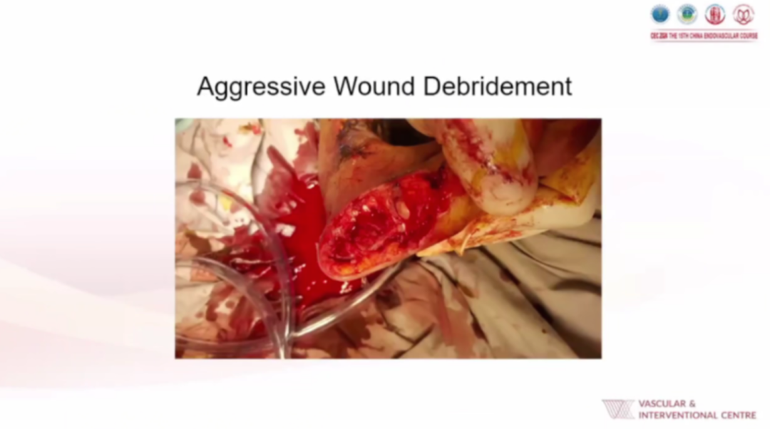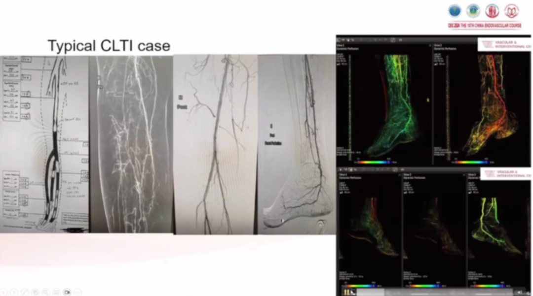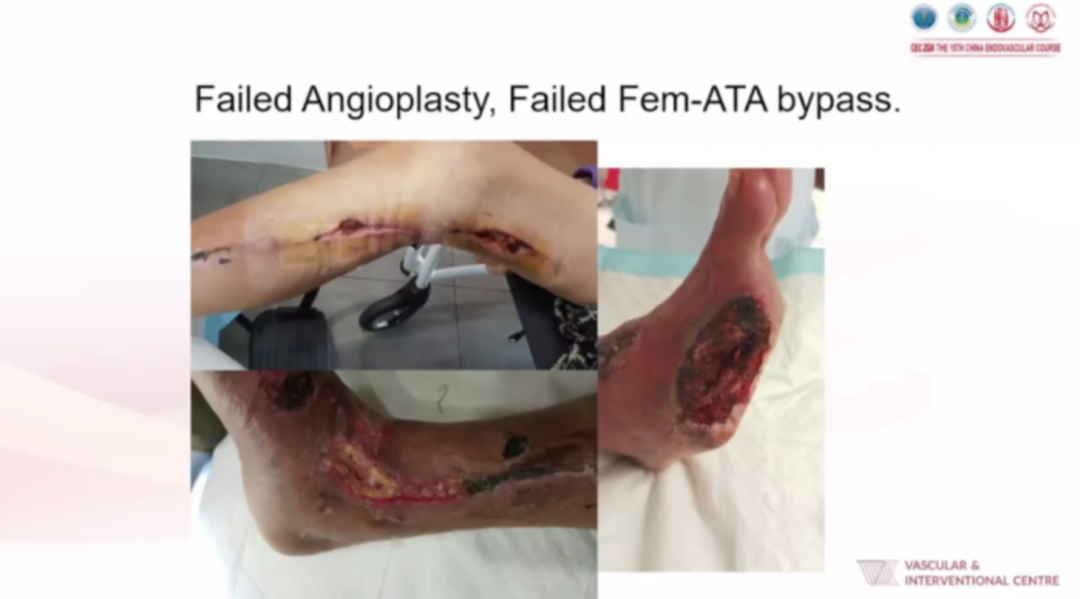 针对难治性CLTI病例,该患者尝试“血管成形术+股-胫前动脉旁路术”均未成功,肢体存在严重坏死、感染伤口,最后临床采用积极血运重建,展示恢复肢体血流的操作,通过介入等手段打通闭塞血管,为后续伤口愈合创造条件。