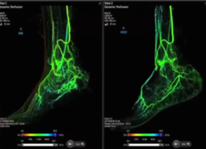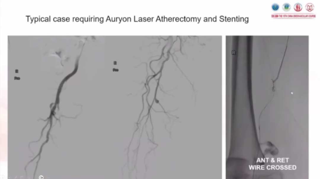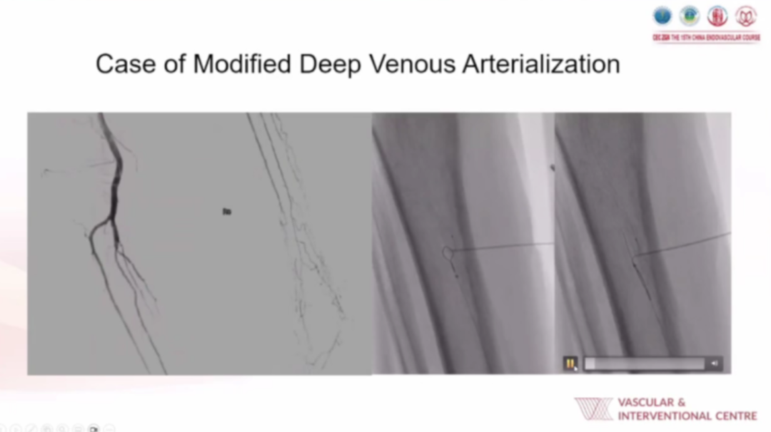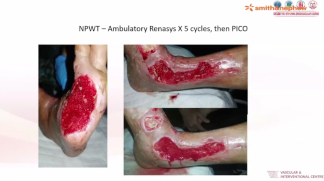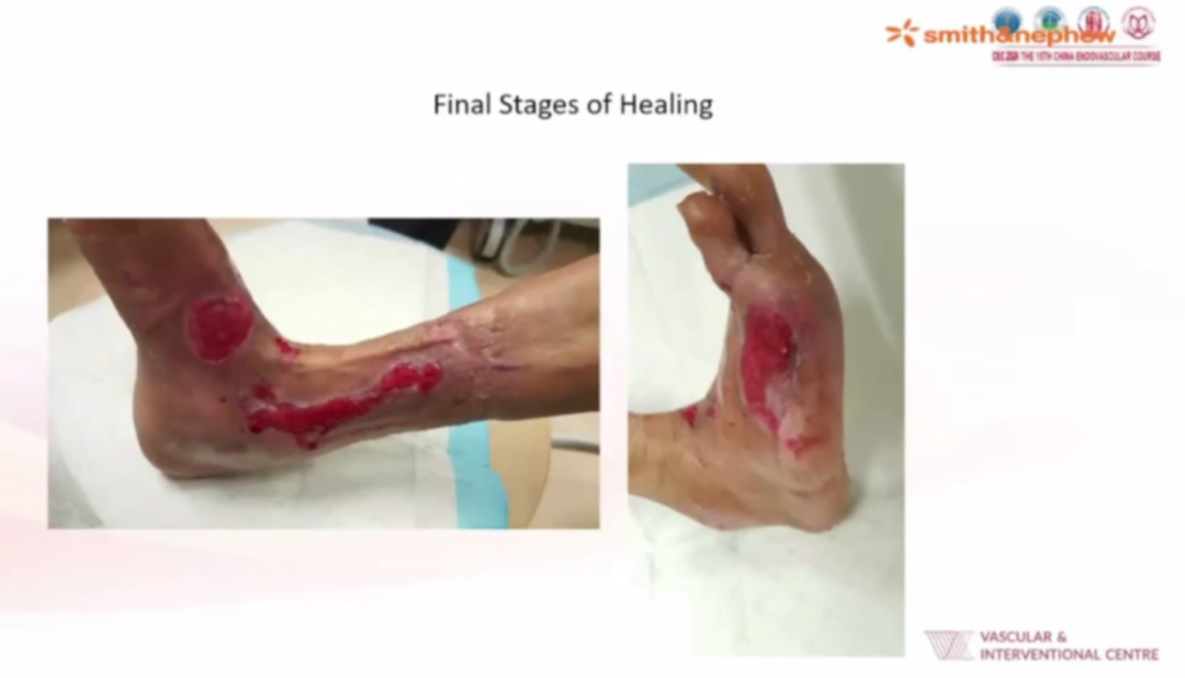针对难治性CLTI病例,该患者尝试“血管成形术+股-胫前动脉旁路术”均未成功,肢体存在严重坏死、感染伤口,最后临床采用积极血运重建,展示恢复肢体血流的操作,通过介入等手段打通闭塞血管,为后续伤口愈合创造条件。
