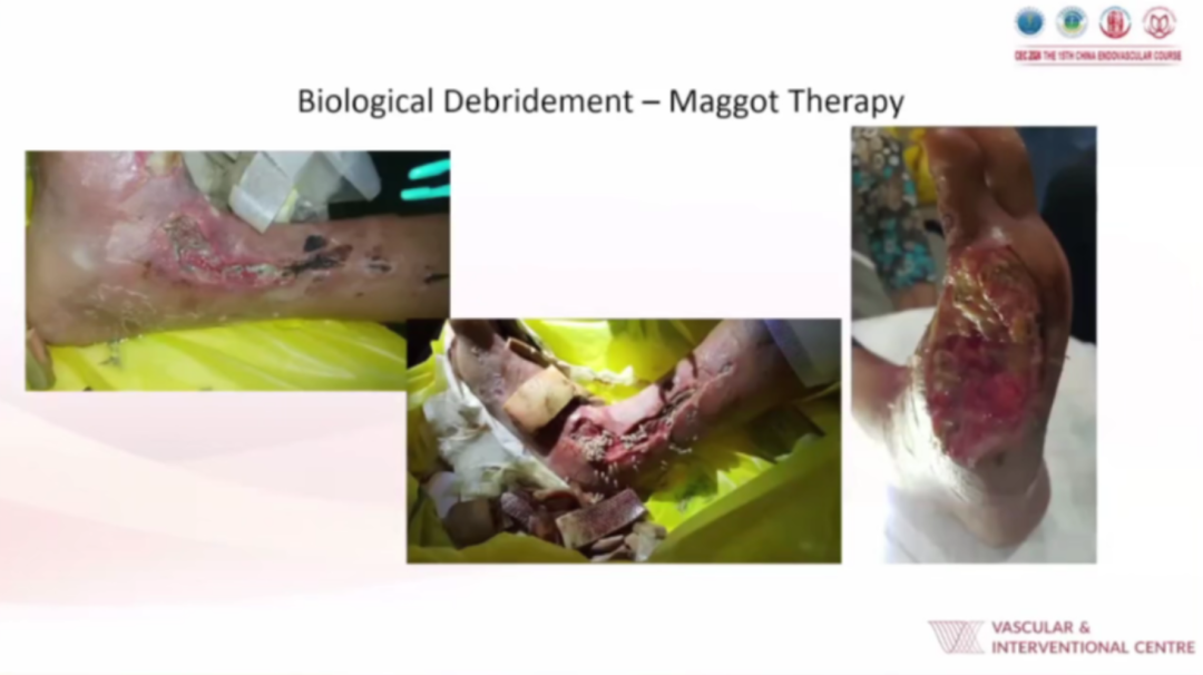 伤口专项管理:①同期清创:血管重建与伤口清创同步完成,直至控制感染、见新鲜出血;②精准干预:强制组织培养,感染/大缺损伤口每3天随访,按需使用碘剂、VAC负压引流、生物敷料;③特殊技术:对难愈合伤口采用蛆虫疗法、5个周期后换PICO)、植皮等。