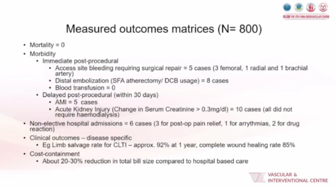 Dr Chua团队分享了2021-2022年800例日间血管手术(含大量复杂CLTI病例)的核心结果,用数据证明其可行性: