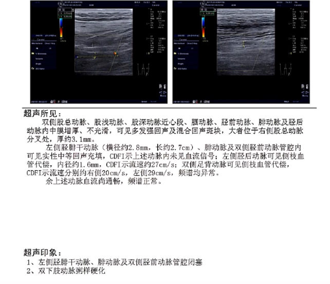 ABI检查(踝肱指数)提示左侧下肢动脉严重狭窄或闭塞。超声提示双侧股总动脉、股浅动脉等多部位动脉内中膜增厚,可见多发斑块;左侧胫腓干动脉、腓动脉及双侧胫前动脉管腔闭塞,左侧胫后动脉及双侧足背动脉依赖侧支血管代偿(流速异常)。