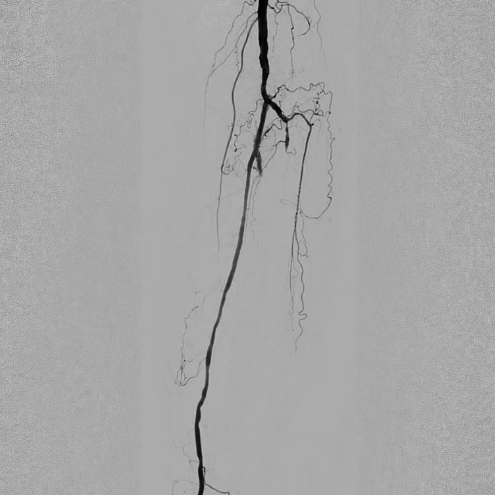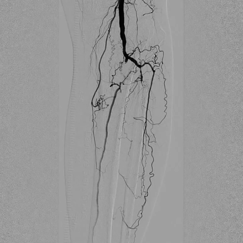 造影显示:胫腓干动脉血流恢复通畅,支架形态及位置理想,胫后动脉显影较术前明显改善;