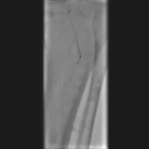 先尝试顺行穿刺,导丝进入内膜下未能成功通过;改为逆行穿刺胫后动脉,导入V18导丝,采用Safari技术(逆行导丝通过闭塞段与近端导管对接)建立工作轨道。
