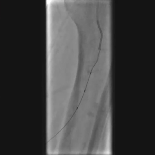 选用2×40mm普通球囊扩张闭塞病变,造影可见局部内膜撕裂严重,形成明显夹层(提示病变坚硬,需支架支撑)。