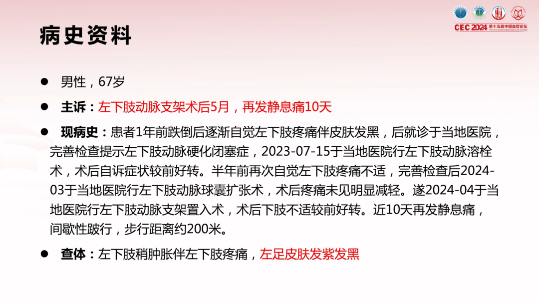 患者男性,67岁,因“左下肢动脉支架术后5月,再发静息痛10天”就诊。患者在1年前因跌倒后出现左下肢疼痛伴皮肤发黑,当地医院诊断为"左下肢动脉硬化闭塞症",2023年7月行左下肢动脉溶栓术,症状暂缓解;2024年3月因症状复发,行左下肢动脉球囊扩张术,疼痛未改善;2024年4月于当地医院行左下肢动脉支架置入术,术后不适缓解,但近10天再发静息痛,伴间歇性跛行(步行距离约200米)。