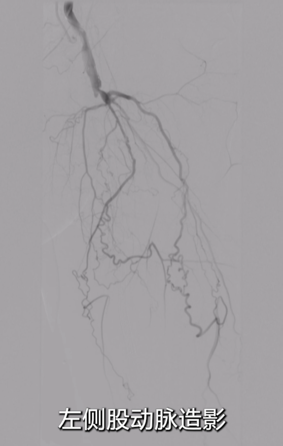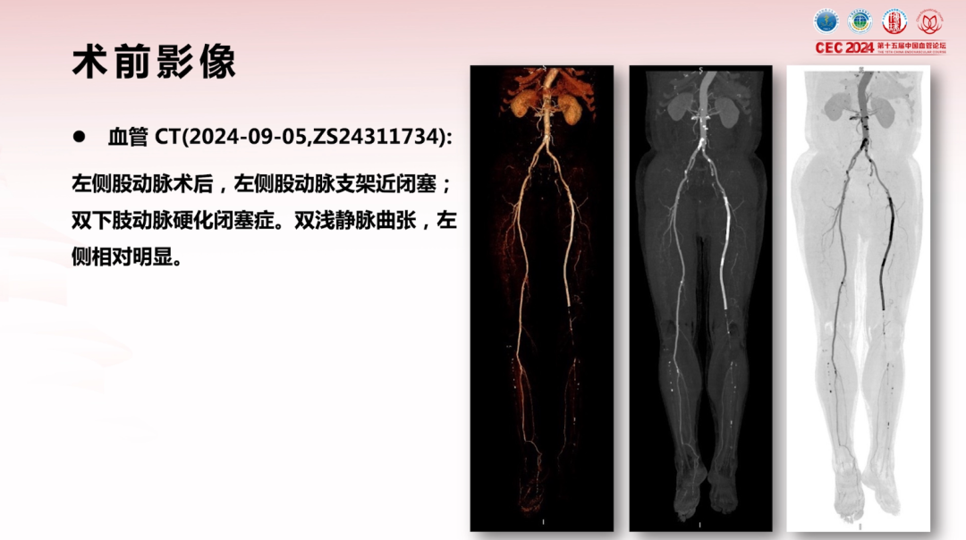 术前CT(2024-09-05):左侧股动脉支架近闭塞,双下肢动脉硬化闭塞症,左下肢浅静脉曲张较明显。