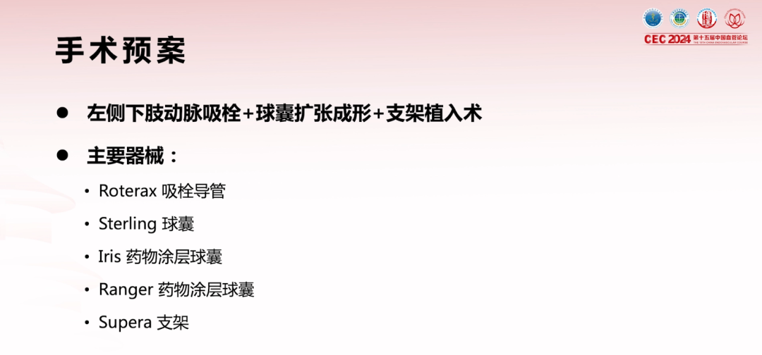 结合患者病史及影像,考虑为支架内血栓形成合并复杂ISR,拟定手术方案:左侧下肢动脉吸栓+球囊扩张成形+补救性支架植入术。