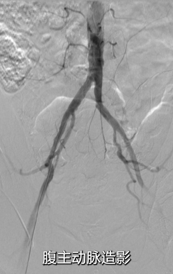 腹主动脉及左侧股动脉造影显示:左侧股总动脉支架几乎完全闭塞,