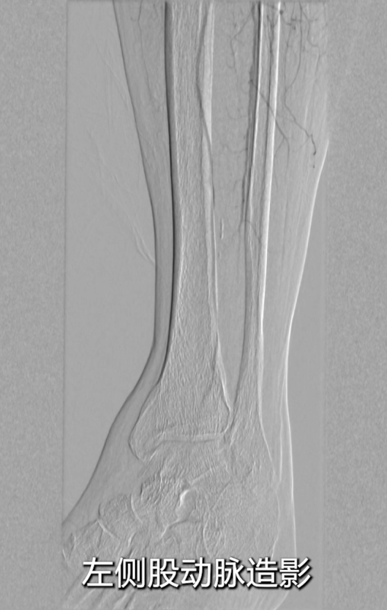 体格检查:左下肢稍肿胀,左足皮肤发紫发黑,肢端可见坏疽;左侧腘动脉、足背动脉、胫后动脉均未触及搏动。