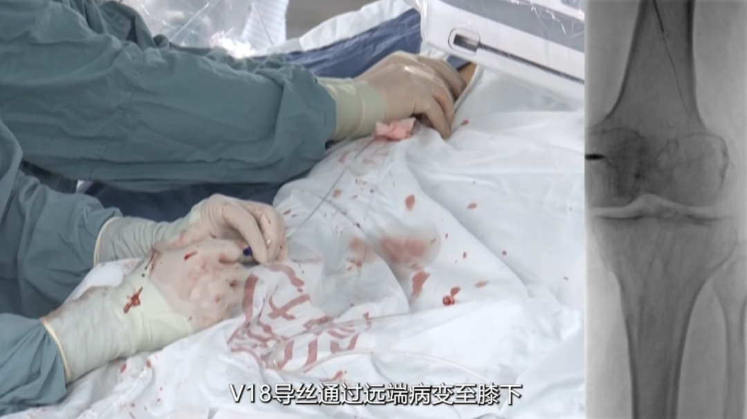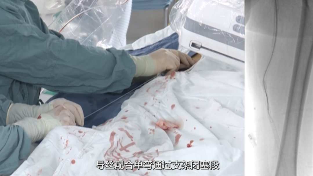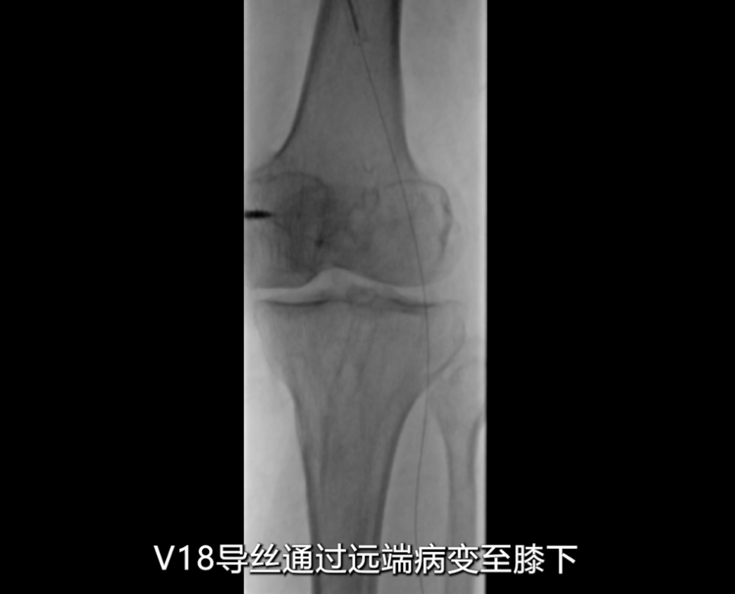 采用单弯导管配合硬导丝及V18导丝,小心通过支架闭塞段,最终将V18导丝顺利送至膝下腓动脉段,未出现血管穿孔等并发症。