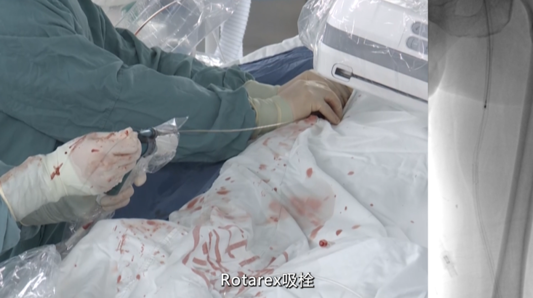 根据导丝通过情况以及术前CT影像,选用Rotarex吸栓导管进行减容:通过病变段后回吸2次,避免血栓脱落至远端(本病例未使用保护伞,基于术者经验);