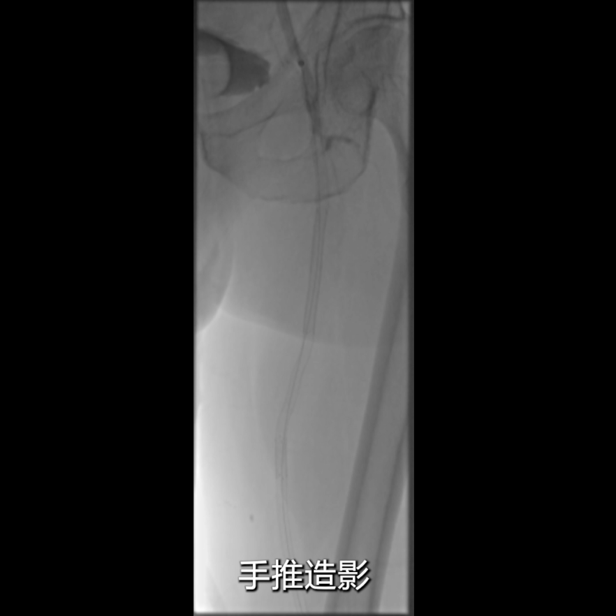 吸栓后即时手推造影:可见支架内形成基本流入道及流出道,血流初步恢复。