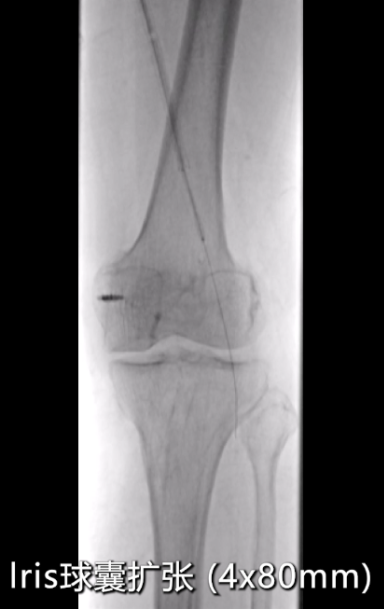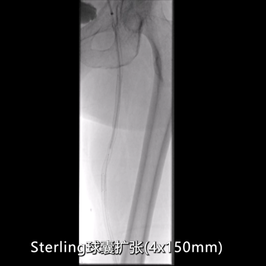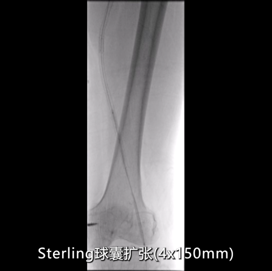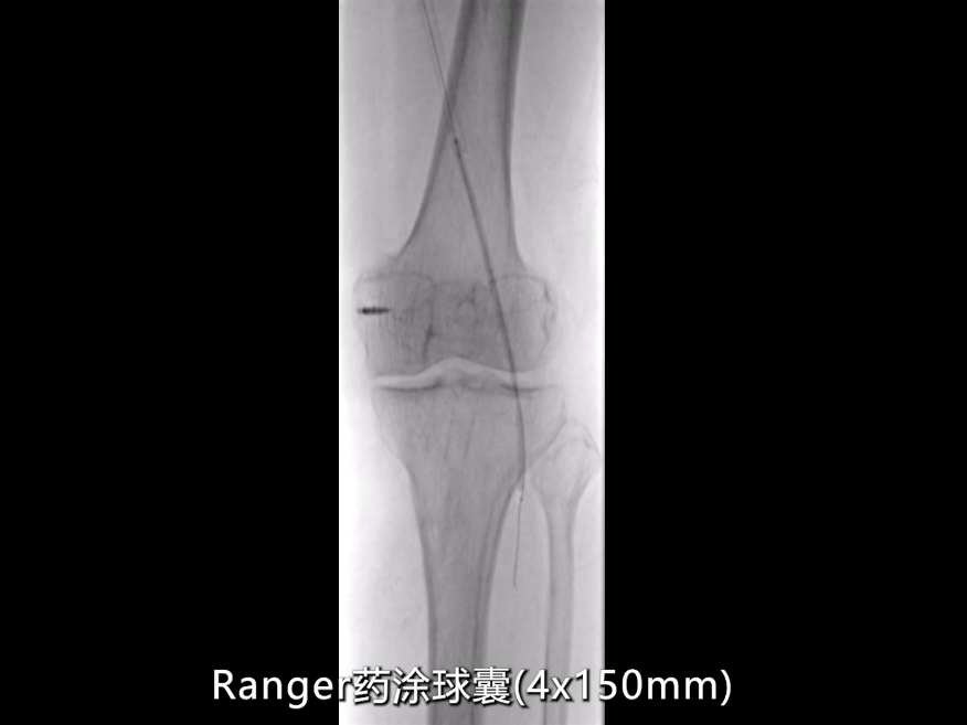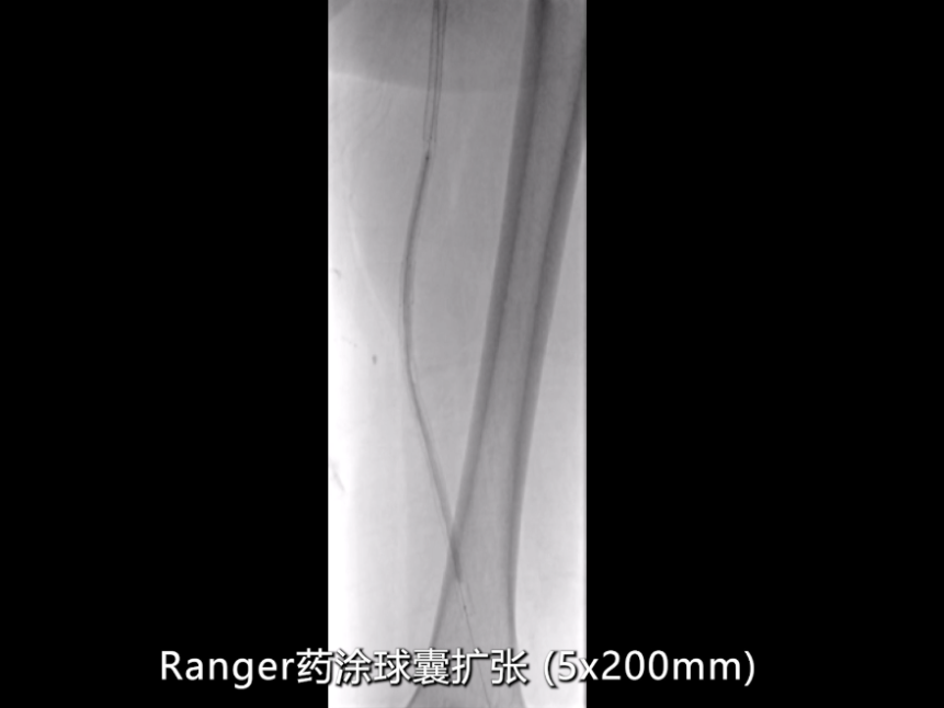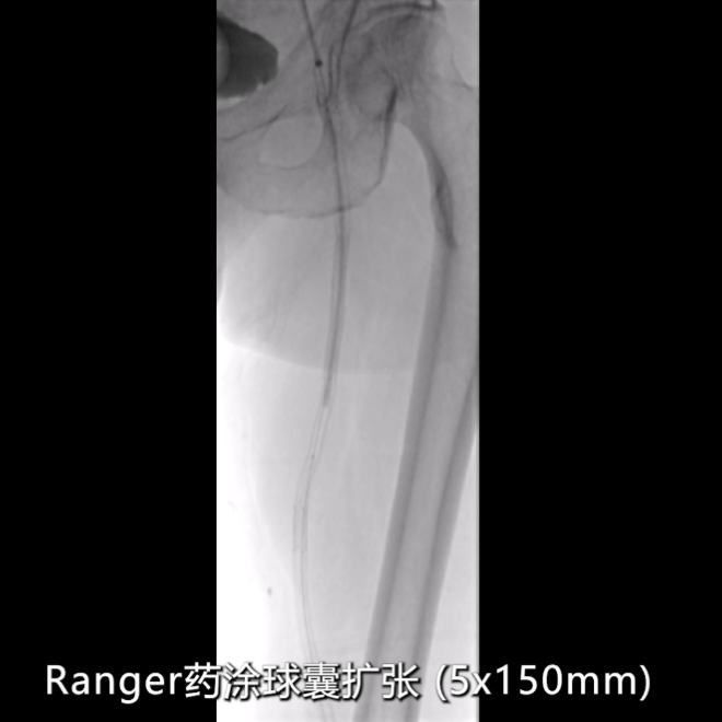 针对CT测量提示的股动脉远端及腘动脉段(直径约5mm),使用4×150mmRanger药物涂层球囊扩张;