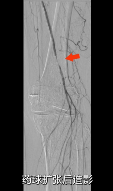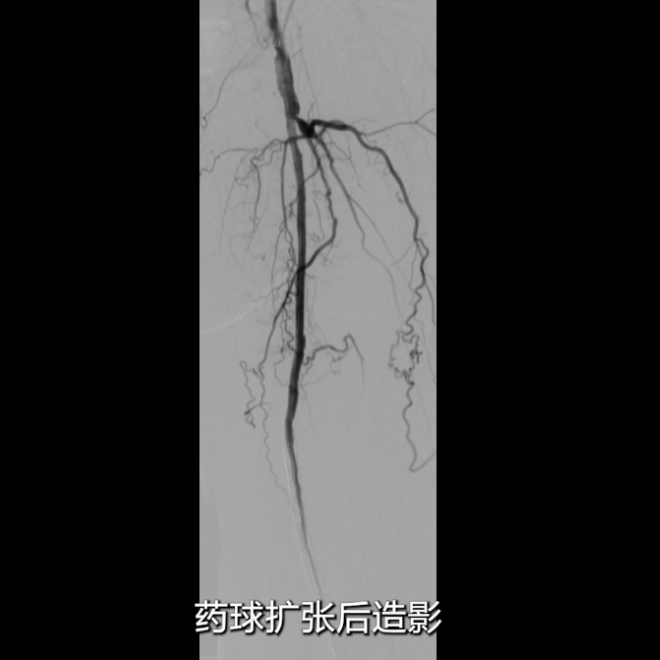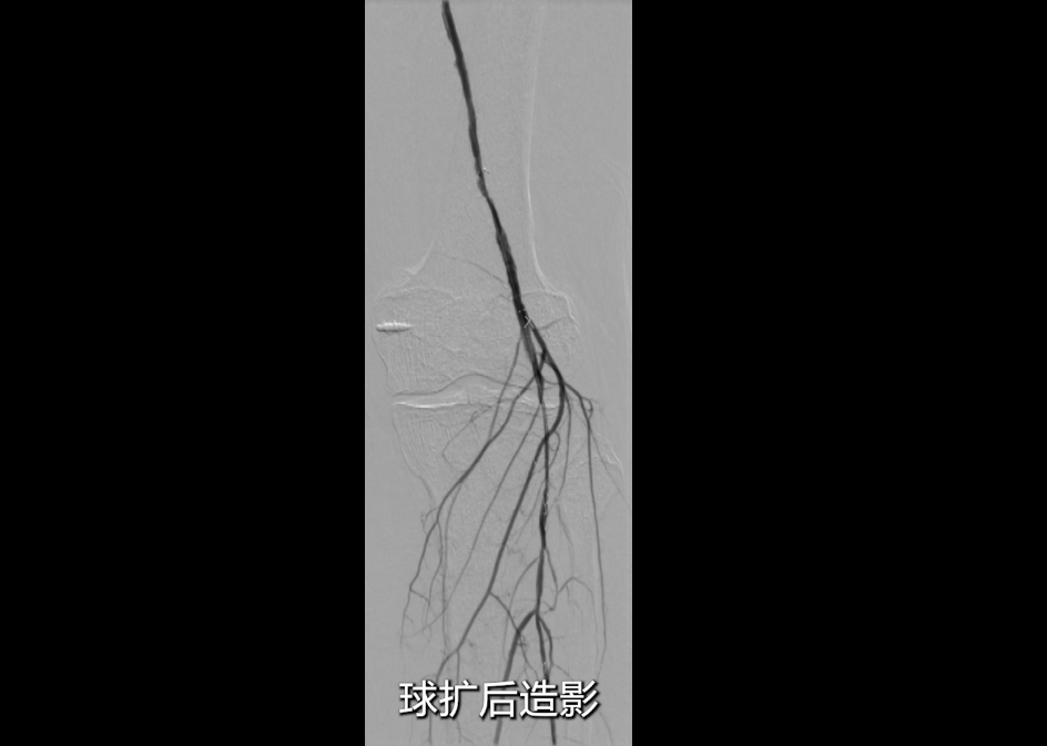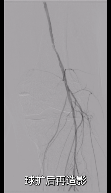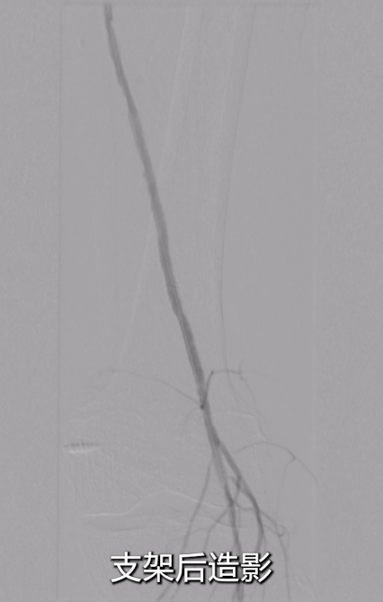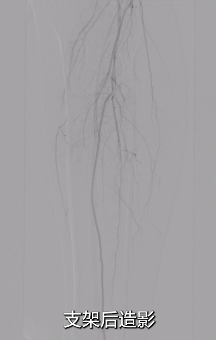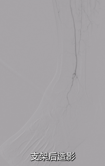 即时造影:支架贴壁良好,病变段完全覆盖,膝下腓动脉及胫后动脉显影明显改善,胫后动脉血流可至足趾;