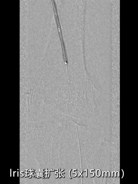 药物球囊扩张后造影显示:支架远端(临近P2段)存在局部狭窄,使用5×150mmIris球囊对病变段再次预扩;