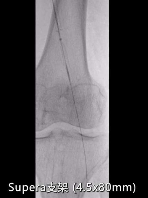 支架长度较长(从股总动脉延伸至收肌管临近P1段),且部分遮挡股深动脉开口;膝下动脉显影稀疏,流出道条件差。