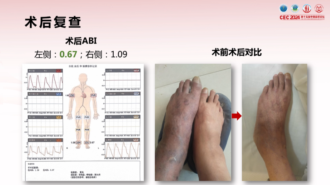 术后ABI:左侧ABI从术前0.32升至0.67,右侧1.09;患者症状改善,左足皮肤发紫发黑明显缓解,静息痛消失。