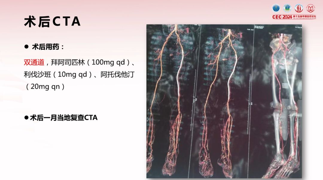 术后1月复查CTA,血管通畅性良好。给予双通道抗凝+抗血小板治疗,预防血栓再形成。