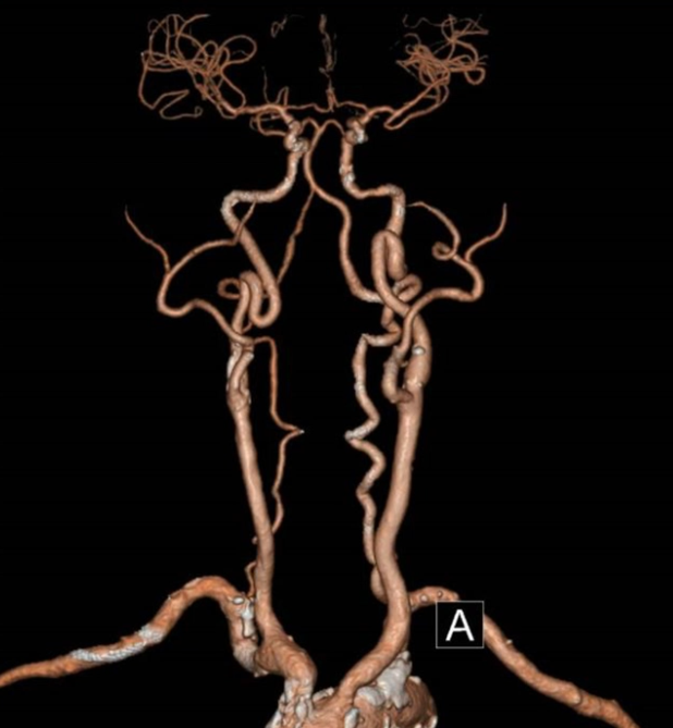 CTA:主动脉及头壁动脉多发斑块,无名动脉起始部支架内重度狭窄。