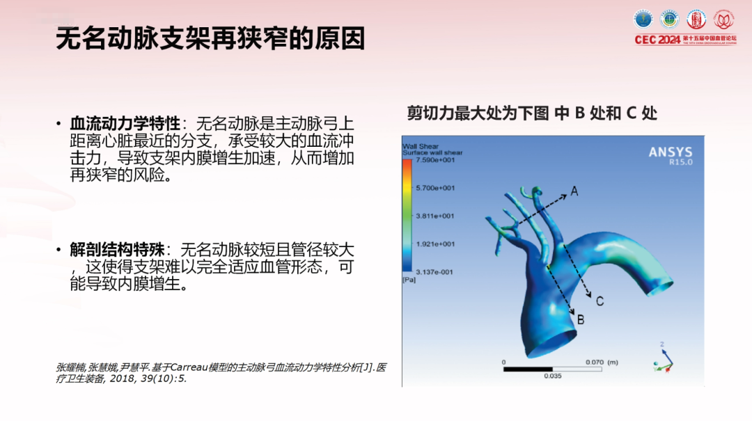 血流动力学:作为主动脉弓上距离心脏最近的分支,无名动脉承受较大血流冲击力,加速支架内膜增生,增加再狭窄风险。
