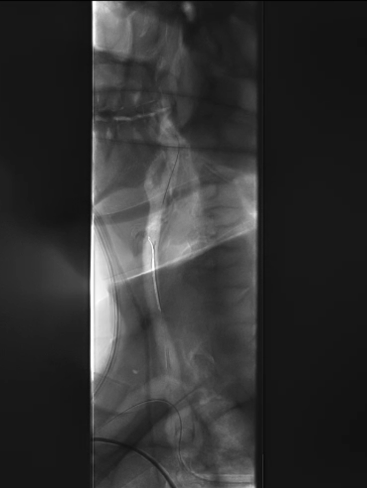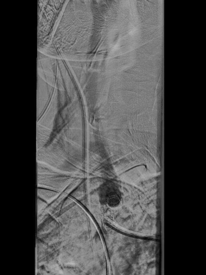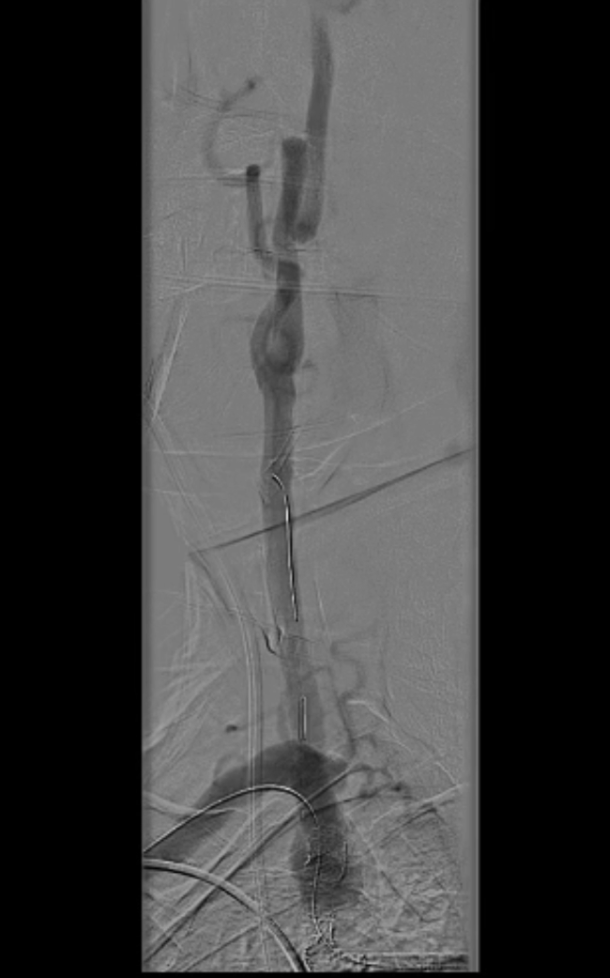 导丝与导管操作:超滑导丝配合多用途导管选入无名动脉,调整角度进入右锁骨下动脉;因主动脉弓扭曲严重,更换支撑导管通过病变段并造影证实