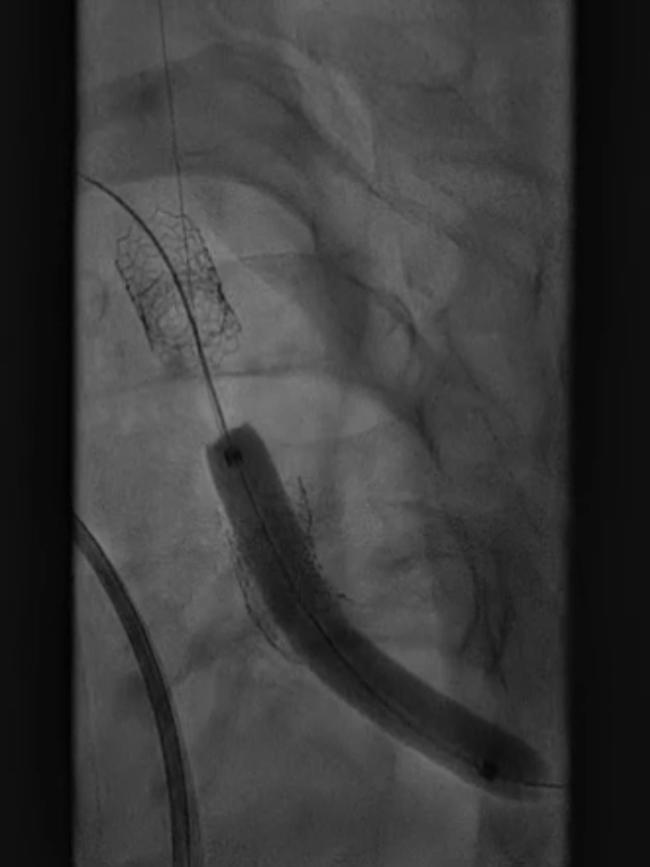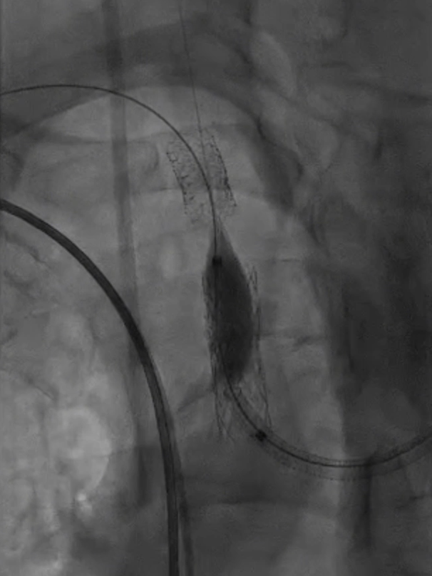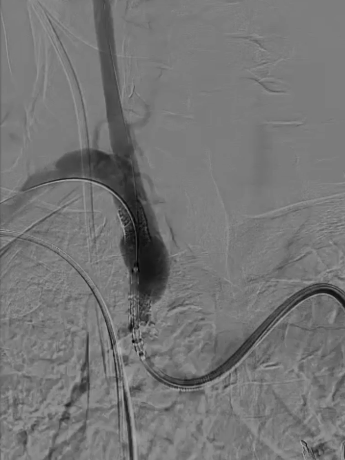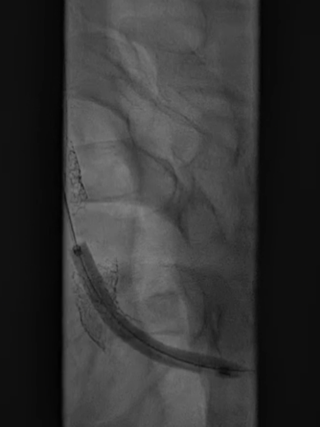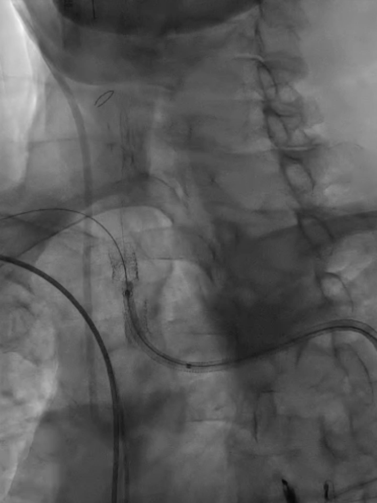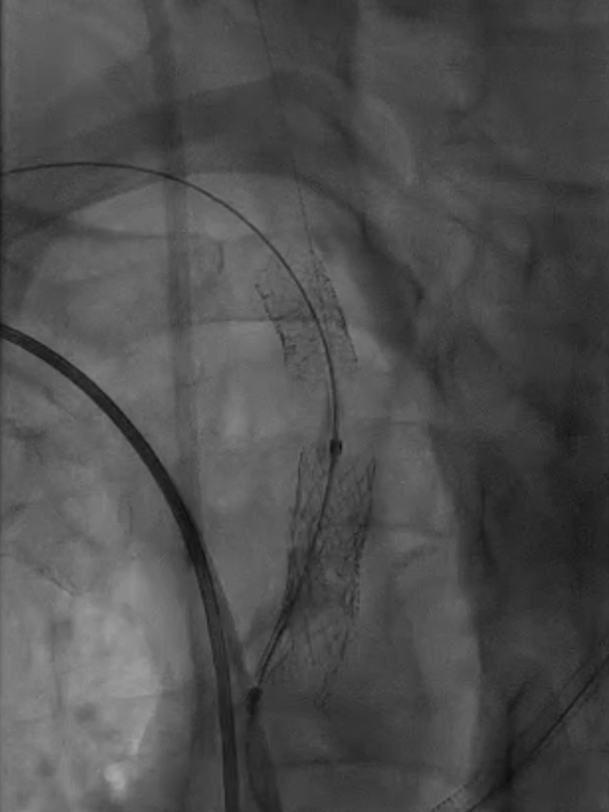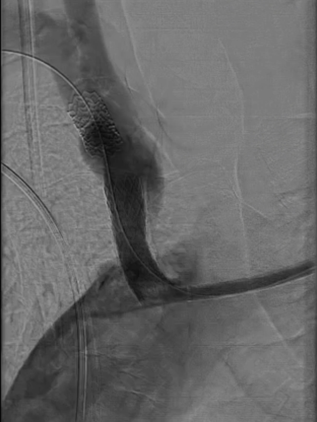 支架置入:通过“球囊带鞘”技术跟进长鞘至支架远端,采用同轴双导丝技术送入VBX8×29mm球扩覆膜支架,多角度造影定位后释放。