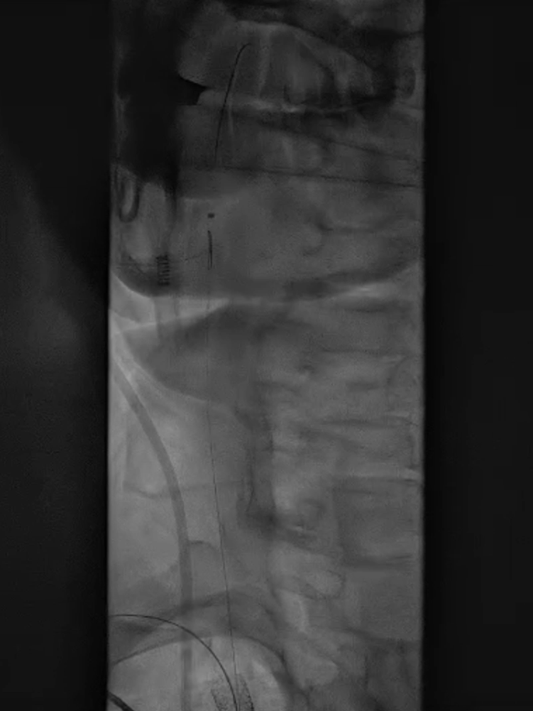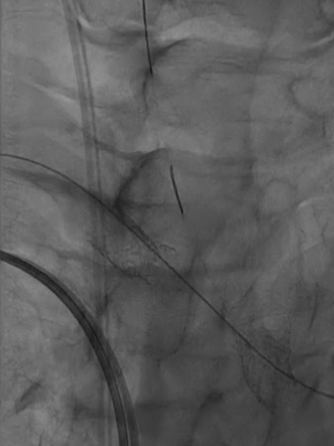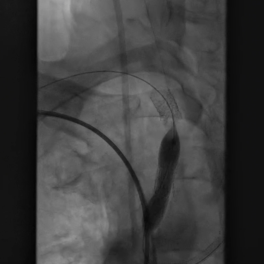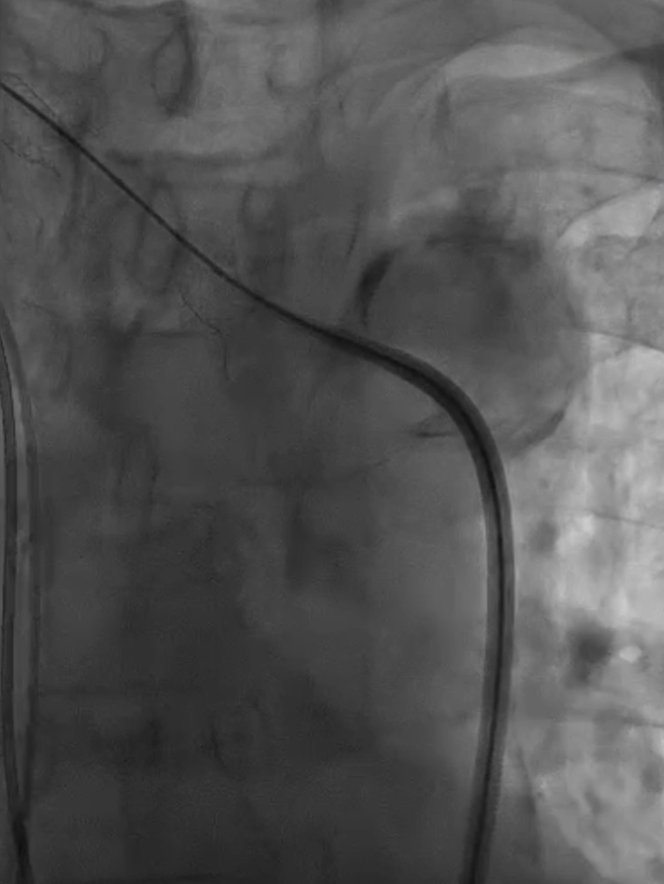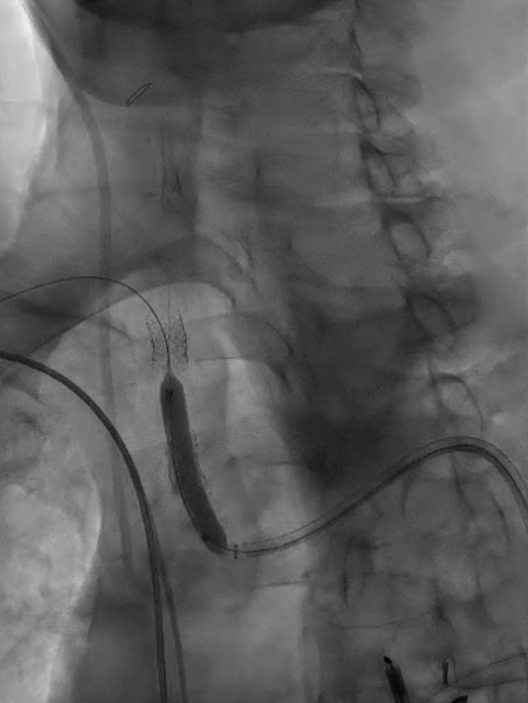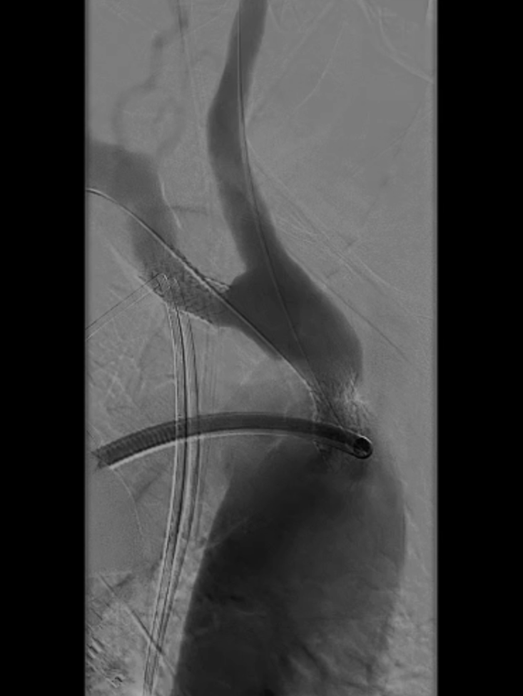 支架置入:通过“球囊带鞘”技术跟进长鞘至支架远端,采用同轴双导丝技术送入VBX8×29mm球扩覆膜支架,多角度造影定位后释放。