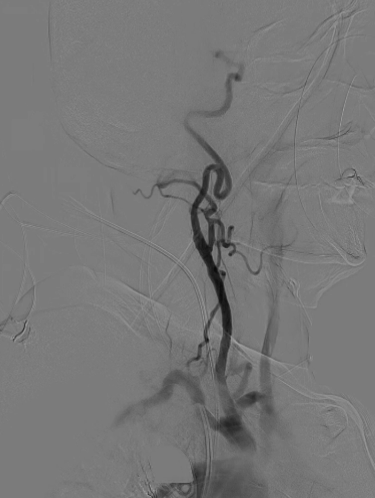 脑保护措施:更换加硬导丝后,采用Filterwire保护伞及0.018导丝选入右颈总动脉,进一步送入右颈内动脉释放保护伞。