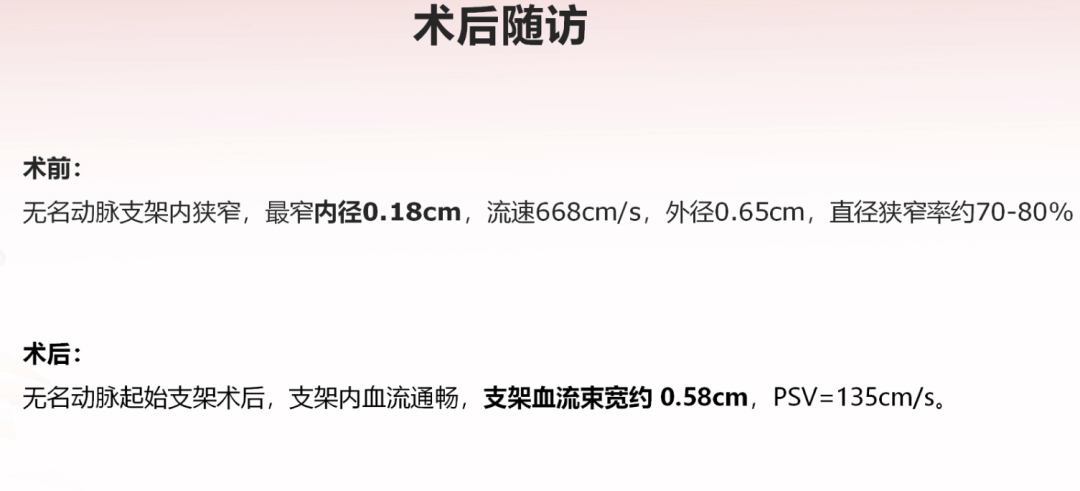 术后3个月复查彩超:无名动脉支架内血流通畅,血流束宽约0.58cm,流速135cm/s,狭窄完全解除。
