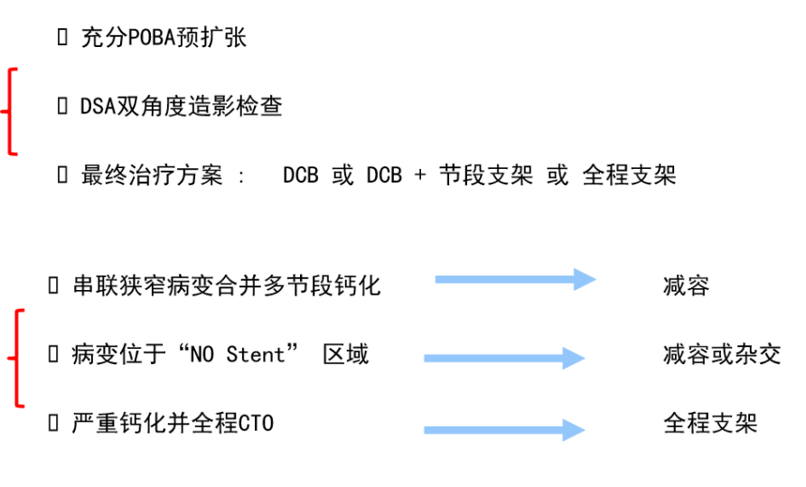 病变位置和严重钙化旋切后的处理方法,包括使用DCB和POBA进行球囊扩张。