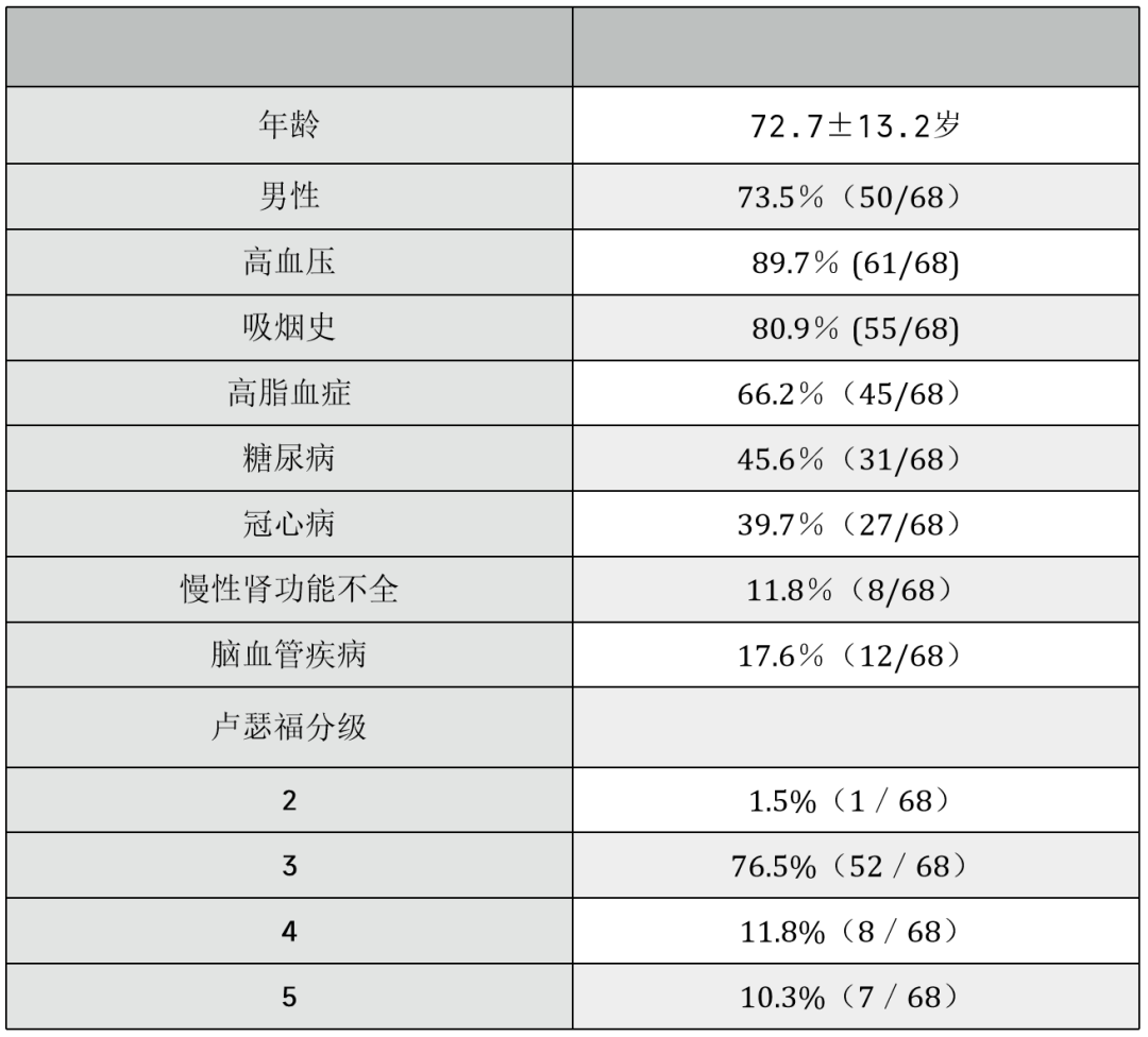 研究对象的平均年龄为72.7岁,男性占73.5%,伴有多种合并症,如高血压、吸烟史、高脂血症、糖尿病等