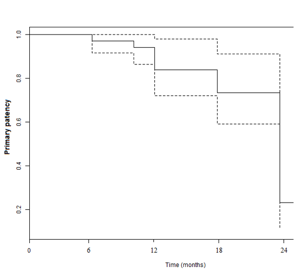 Kaplan-Meier生存分析预测的靶病变一期通畅率在1年和2年分别为74.2±7.6%和67.7±6.4%。