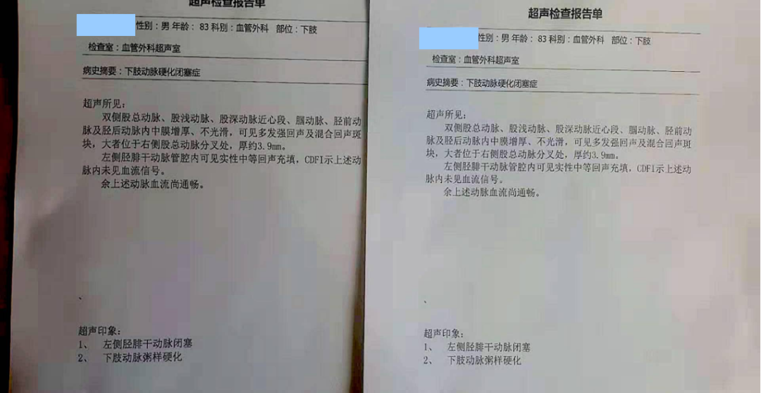 DUPLEX:左侧SFA起始PSV 360cm/s ;中段320cm/s;P2 380cm/s;膝下动脉闭塞