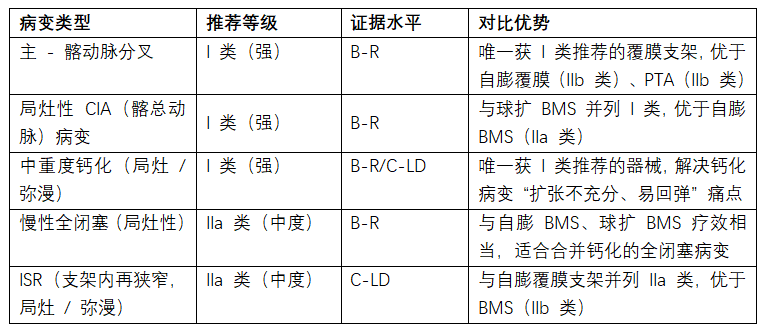 推荐等级(I 类=强推荐,IIa=中度推荐,IIb =弱推荐,III 类=无疗效/有害)及证据水平(B-R=随机对照研究,B-NR=非随机研究,C-LD=有限数据,C-EO=专家意见),球扩覆膜支架的核心优势场景如下: