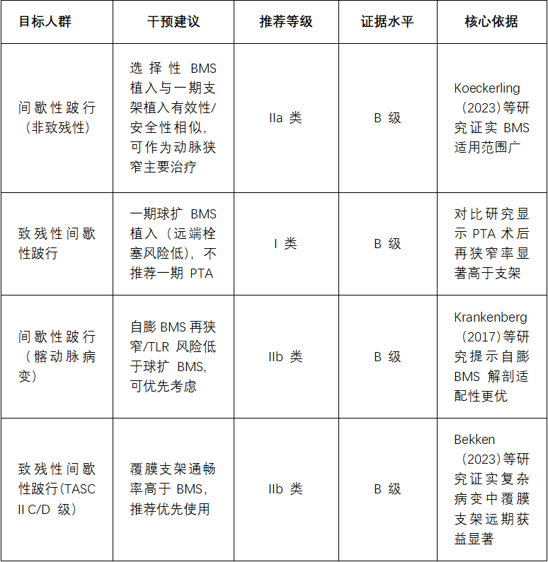 对TASC C/D级复杂病变,覆膜支架优于裸支架(Ib级证据)。