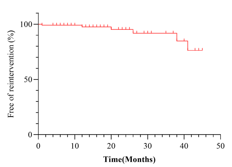 短期疗效:技术成功率 100%,围术期系统并发症发生率 4%(含 2 例死亡:1 例心衰加重、1 例脑梗),手术相关并发症 12%(以血栓栓塞、血肿为主,多经对症治疗缓解);