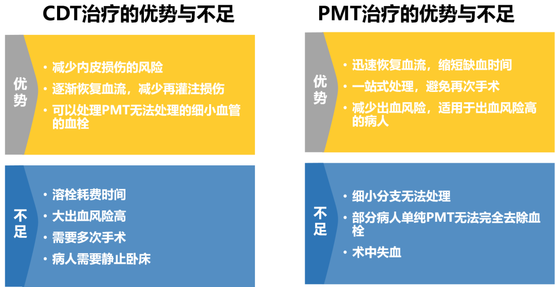 PMT:优势在于迅速恢复血流、缩短缺血时间、一站式处理、减少出血风险,不足在于细小分支无法处理、部分病人单纯PMT无法完全去除血栓、术中失血。