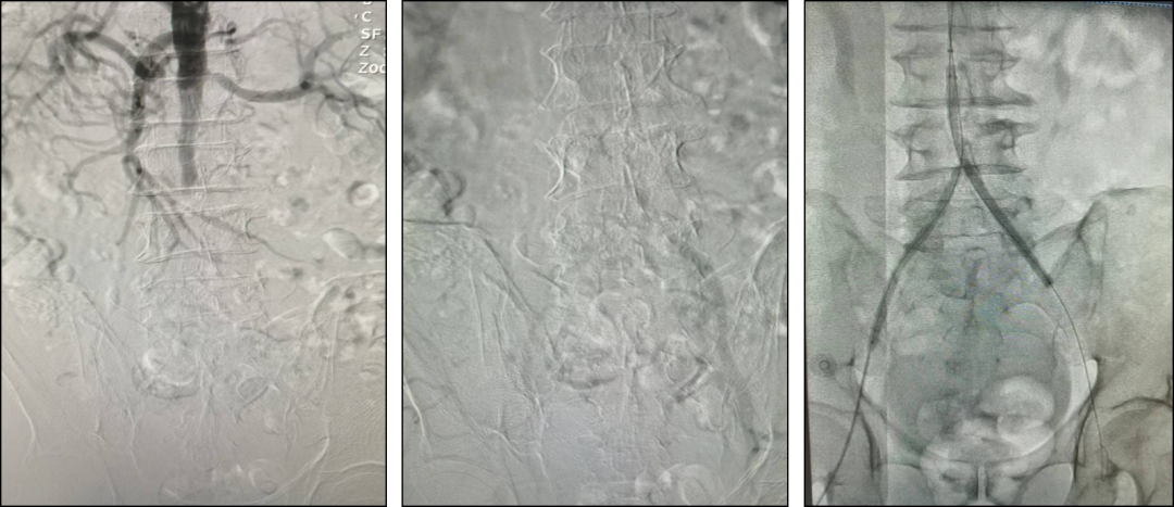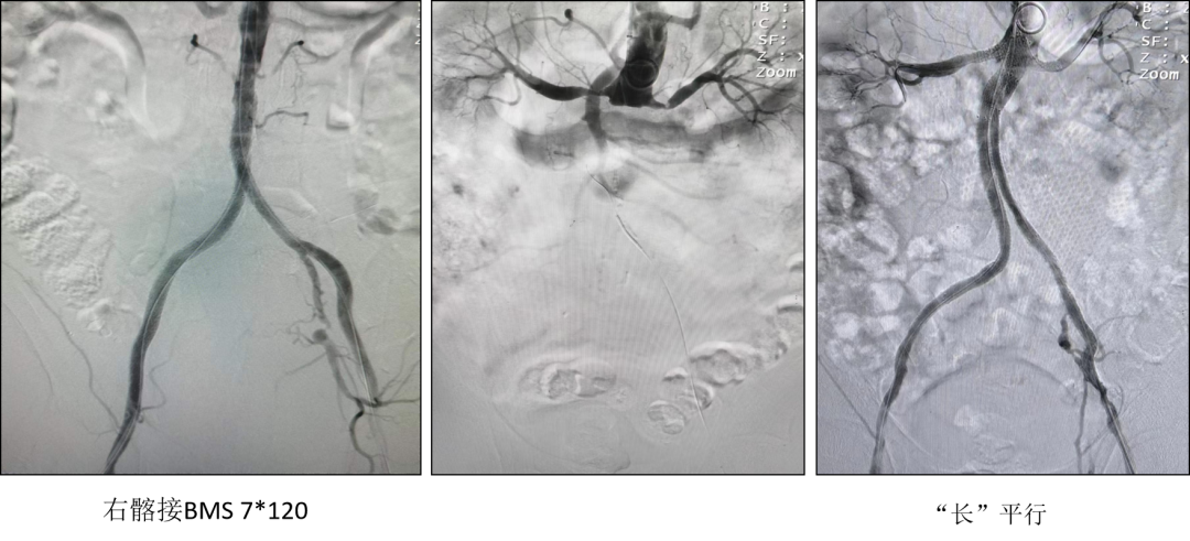 C/D. 造影提示双侧髂动脉复通,支架顺应原动脉扭曲